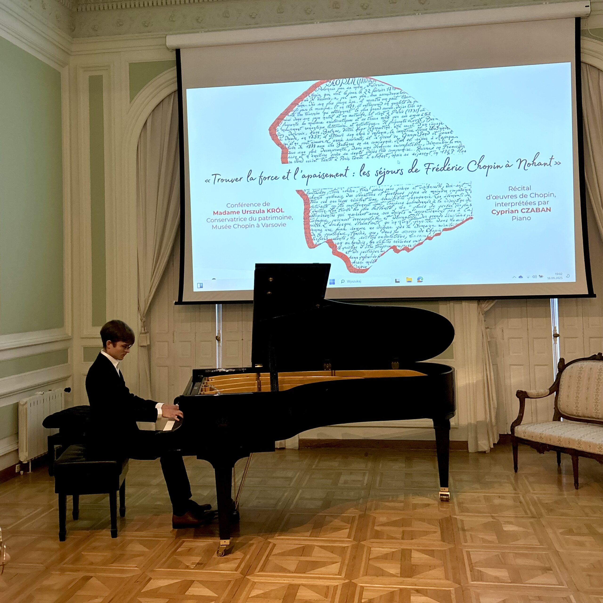 La conférence a été suivie d’un récital de piano par Cyprian Czaban, jeune pianiste originaire de Varsovie, vivant et étudiant à Paris. L’artiste a interprété des œuvres de Fryderyk Chopin, notamment la Ballade en sol mineur op. 23, la Barcarolle en fa dièse majeur op. 60, ainsi que des Préludes choisis de l’opus 28. Ses interprétations, pleines de subtilité et d’émotion, ont parfaitement reflété l’esprit romantique de la soirée dédiée à l’héritage musical de Chopin.